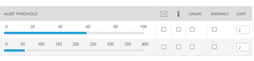 The slider controls are used to set the alert and warning thresholds. Here, the alert threshold for CPU USAGE (%) is set to 80, which means that any data point that exceeds it will raise an alert.