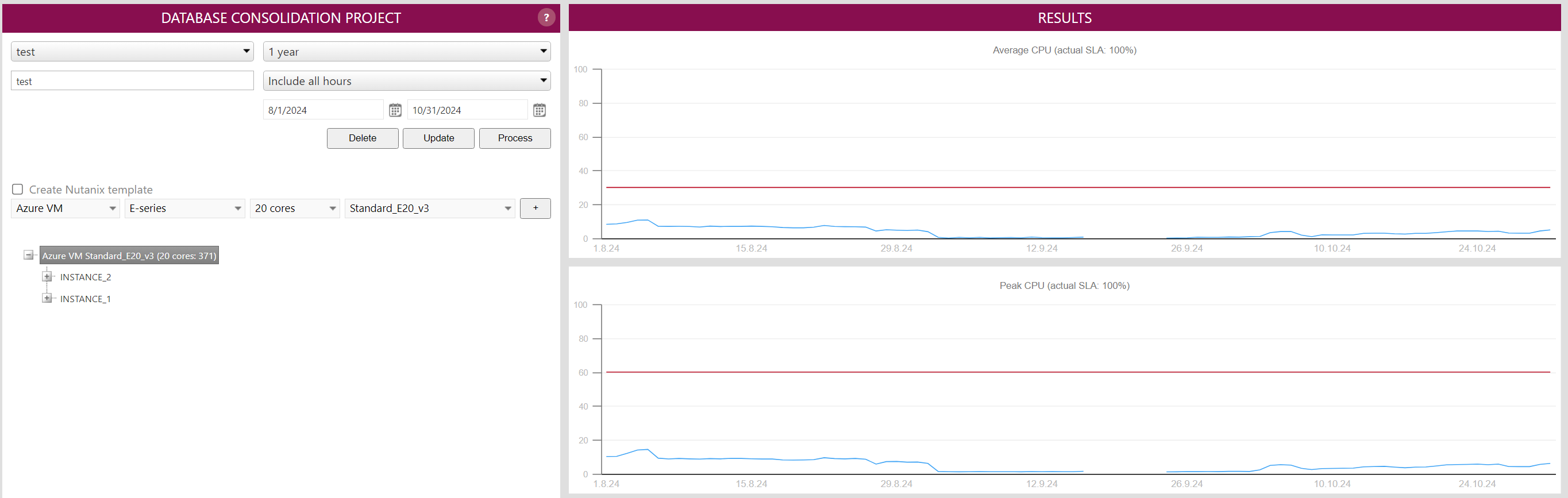 - Add more databases onto existing instances by dragging them from the tree onto an already created instance node. The numbers in the parentheses next to the system databases reflect the number of source instances; in this case the two user databases come from two different instances. The workloads of the target system databases are a sum of the source system databases' workloads.